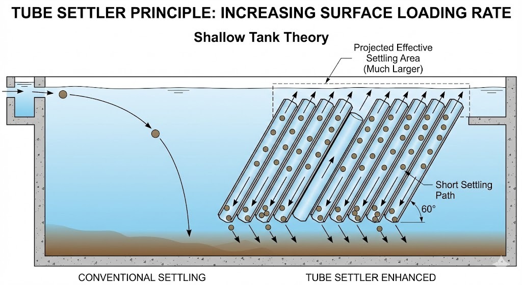 Lonnaitheoirí Tube úsáid a bhaint as sraith bealaí heicseagánacha claonta chun éifeachtúlacht socraithe solad i soiléiritheoir a fheabhsú. Trí mhéadú ar an limistéar socraithe éifeachtach (bunaithe ar an Dlí Hazens nó Teoiric Umar Éadomhain ), ligeann na modúil seo do cháithníní titim achar an-ghearr sula mbuaileann siad balla an fheadáin agus sleamhnú go bun.